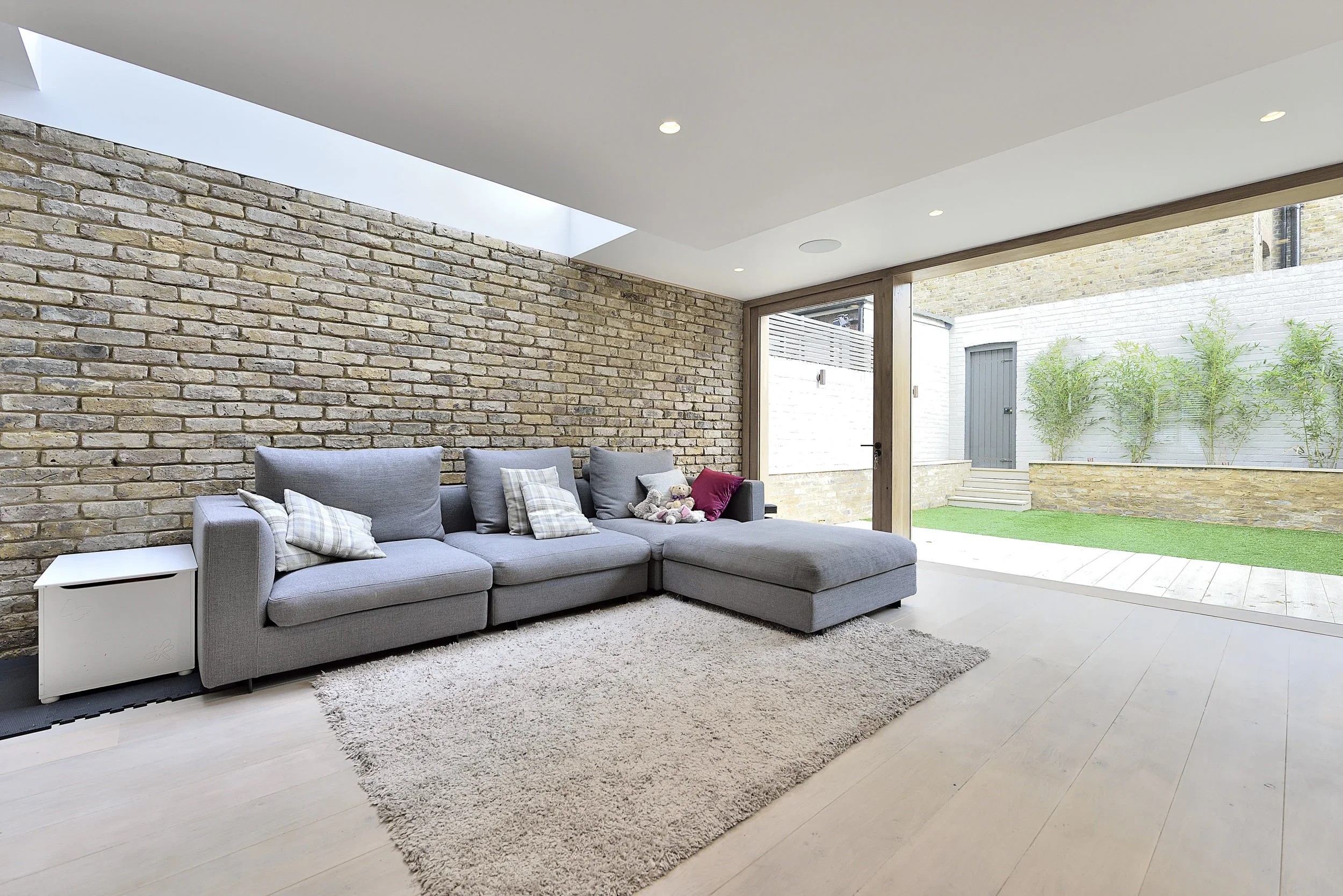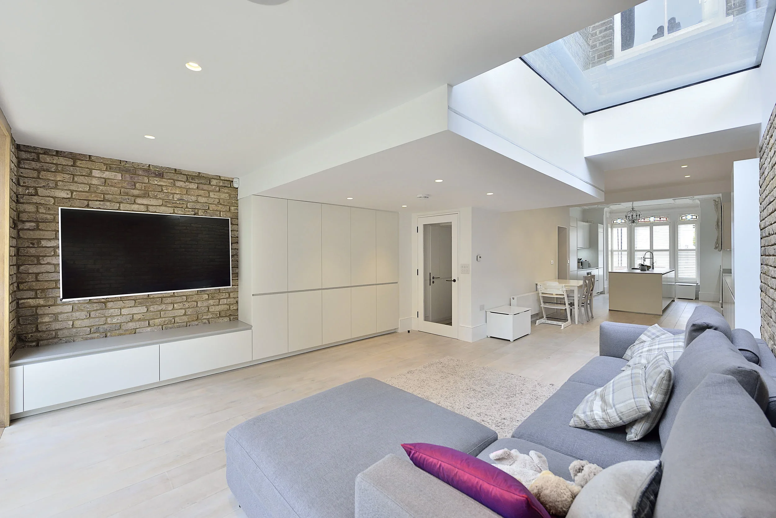 The large glazed areas on the North facade are designed to maximise natural daylight into the heart of the building, together with a large rooflight on the South East area of the new flat roof. The external material finish of the extension matches the London stock brickwork of the existing house.