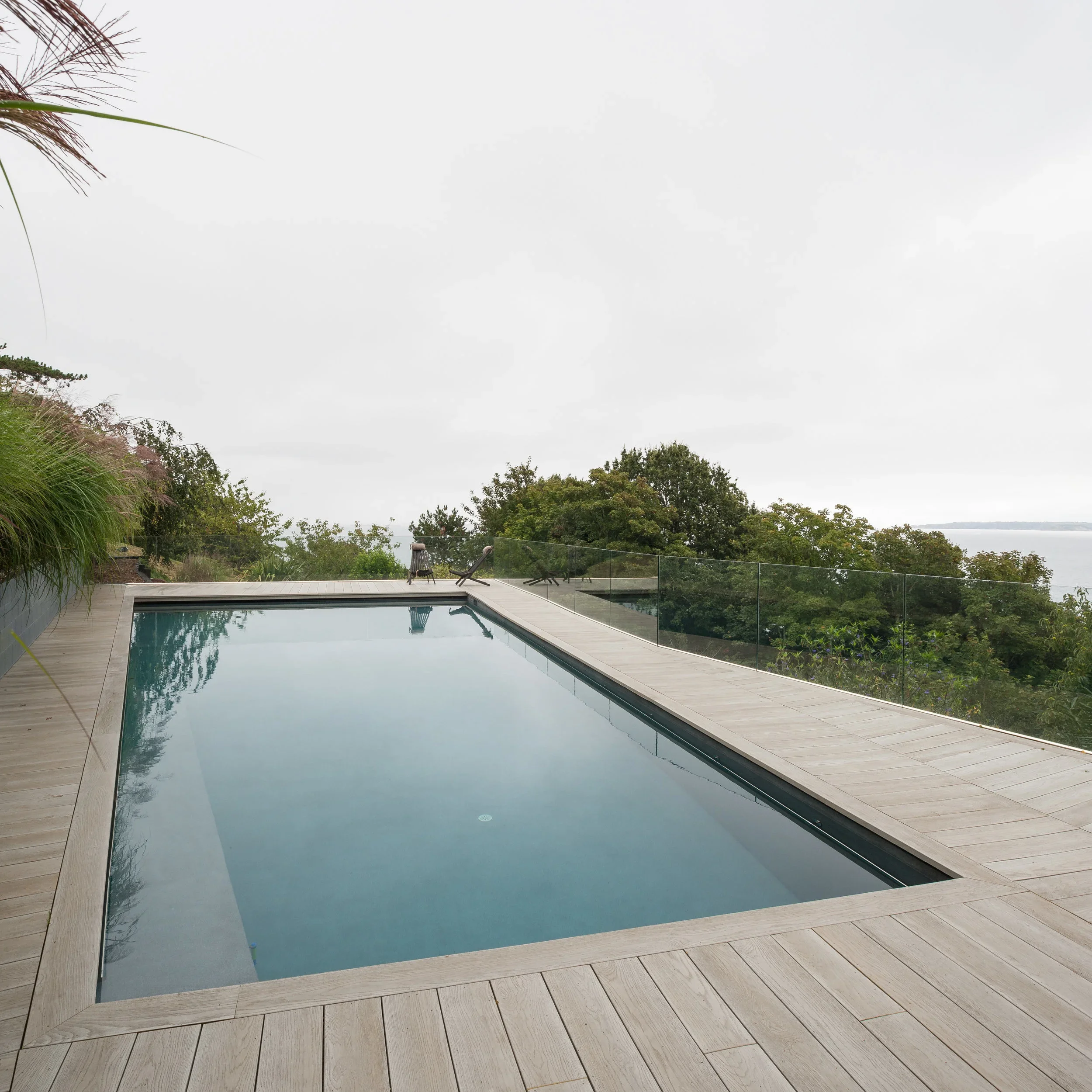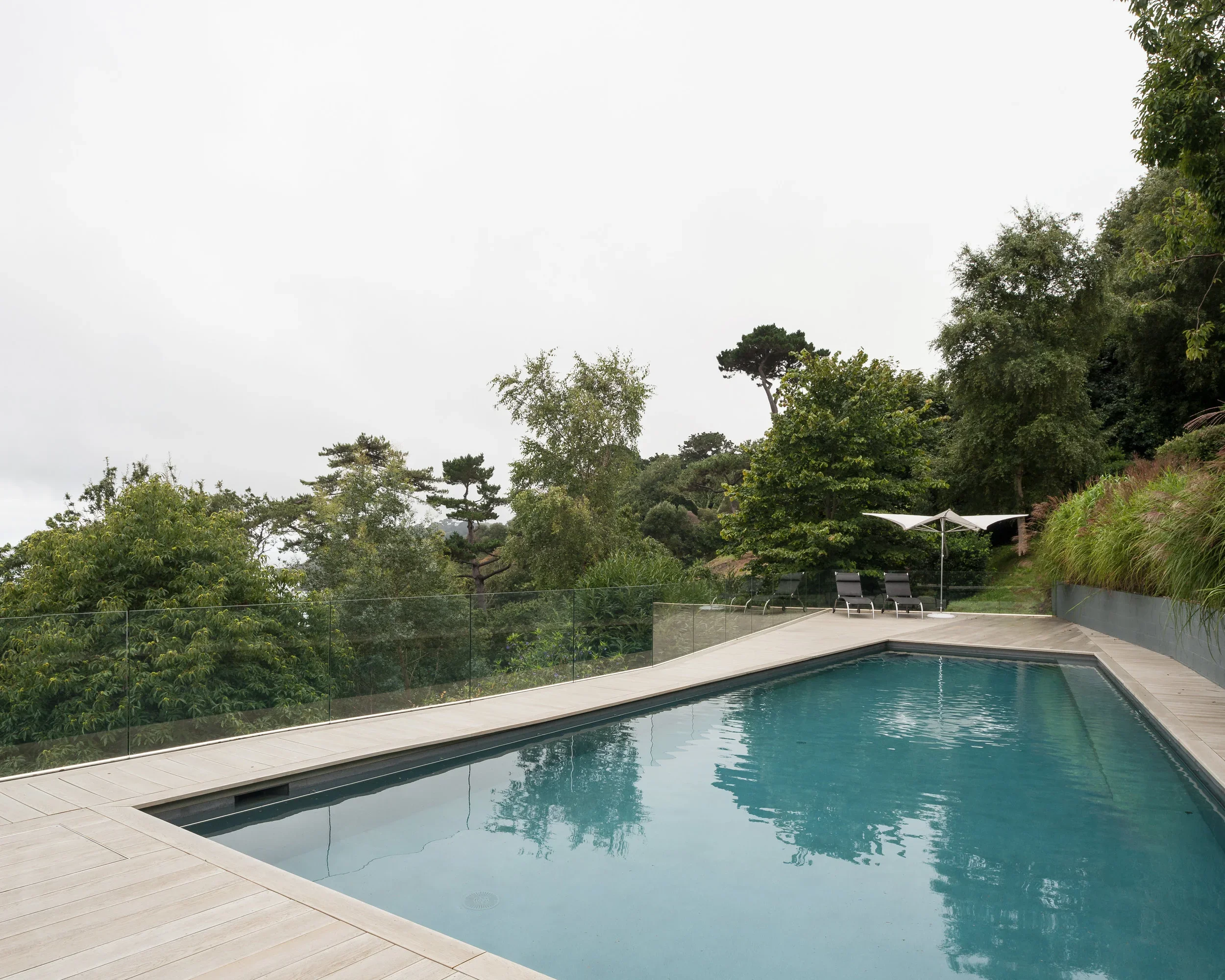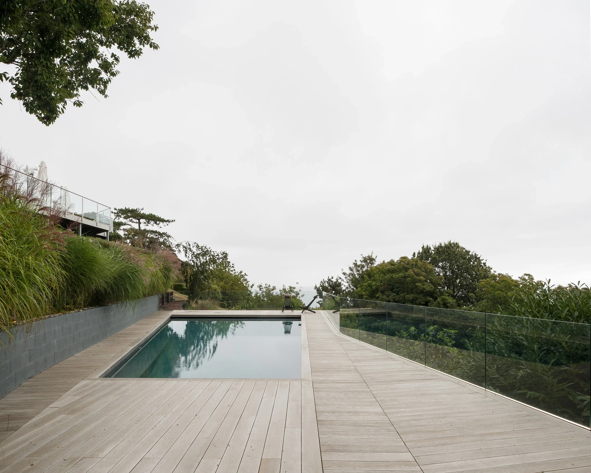 We worked closely with the structural engineers to design a pool structure that was appropriate to the sloping landscape, but also be cost effective. An innovative hybrid trench and backfill foundation was designed to use the majority of the excavated materials on site, while providing a sound base for the specialist pool contractor to set up shuttered and blown concrete for the pool shell. A steel frame wraps around the concrete structure to provide the base for the composite decking. Frameless glazing runs around the perimeter of the pool with no visible fixings, allowing uninterrupted views. The pool is heated by an air source heat pump and covered with a high specification solar cover to keep heat loss to a minimum. The pool is accessed via a cast ramp and includes stainless steel safety handrails around the internal perimeter. We worked closely with the pool specialist to design a slight change in level of the deck allows pool skimmers to be installed while keeping the freeboard depth a minimum. This also provides the minimum clearance for the retractable cover which can be remotely controlled.