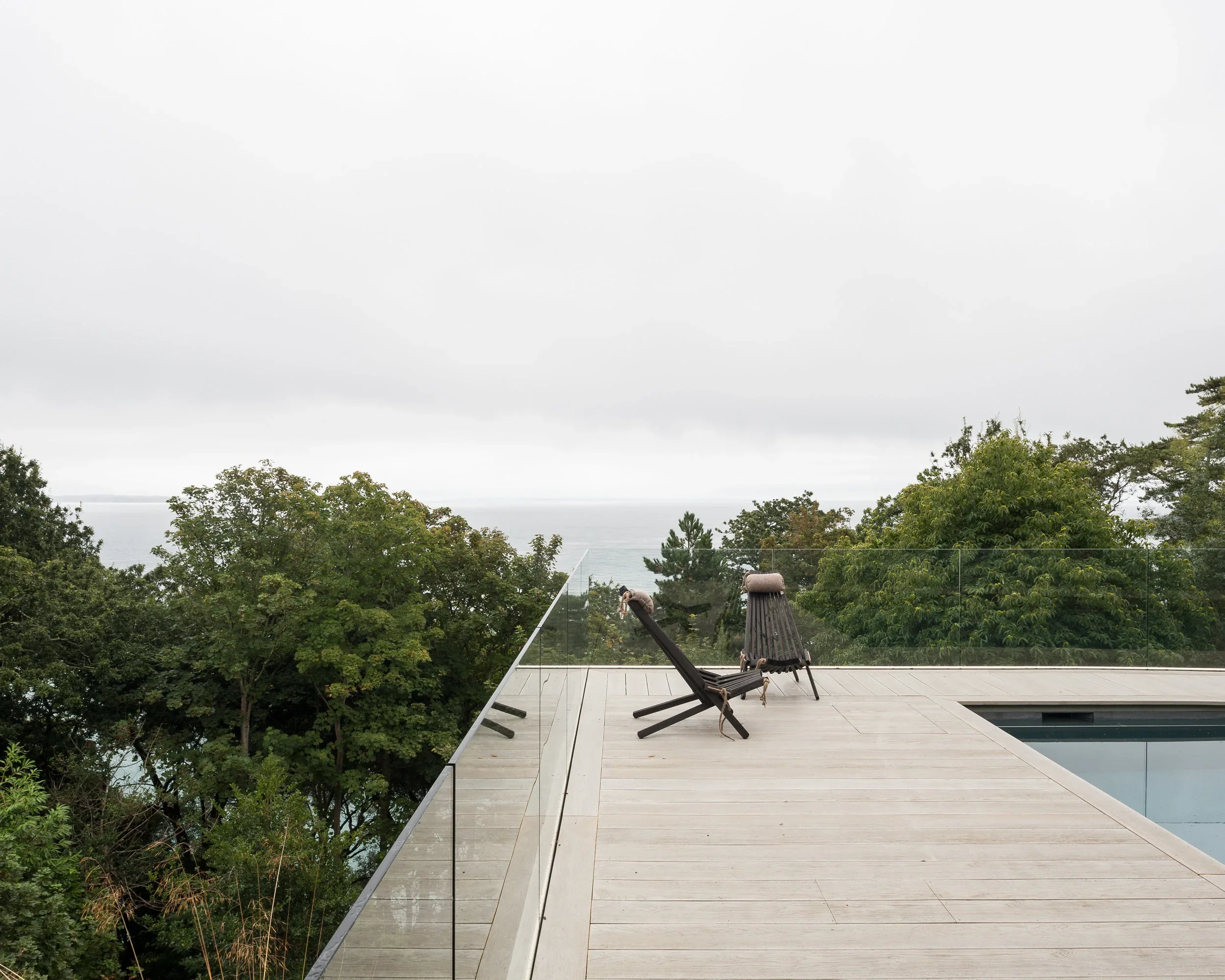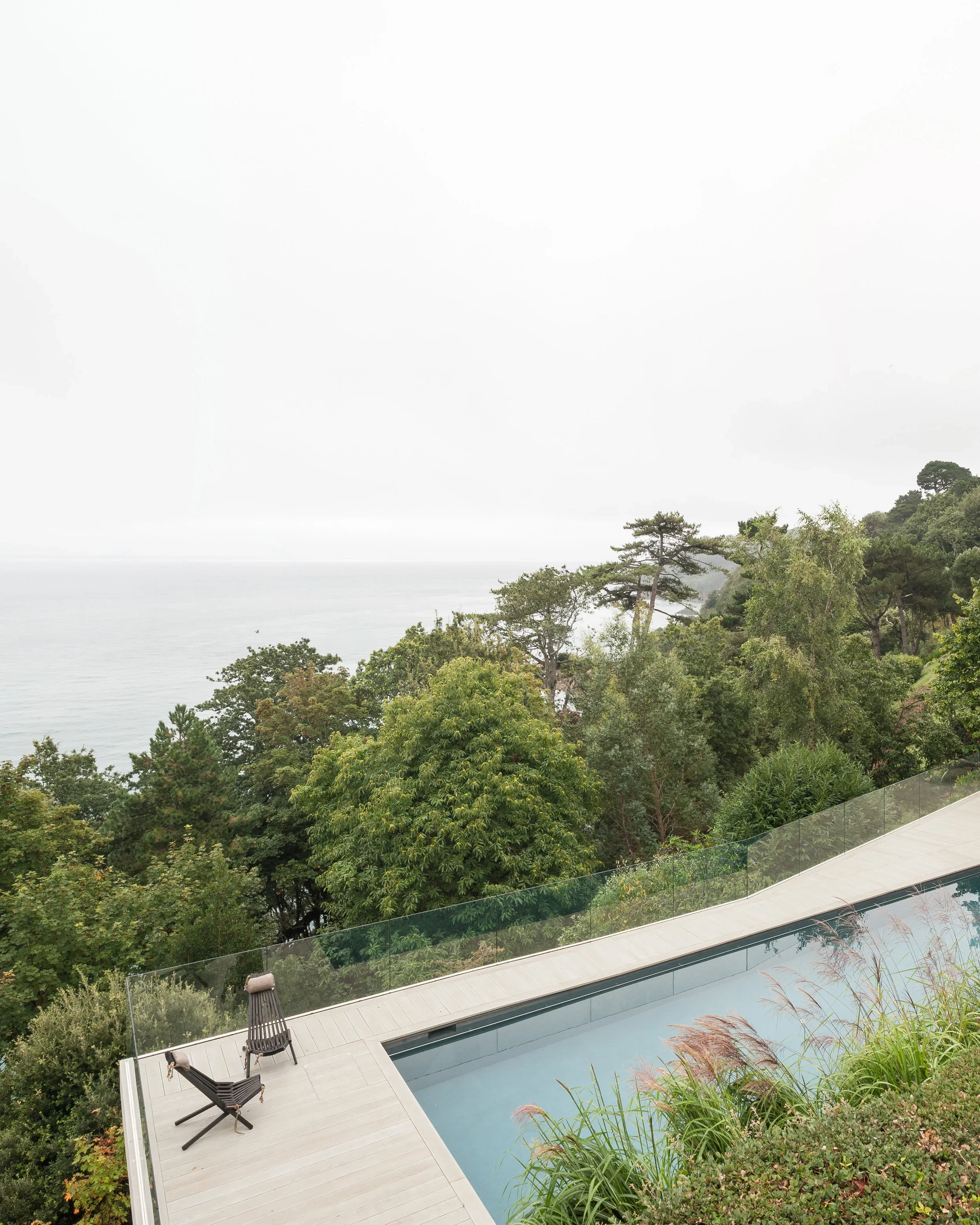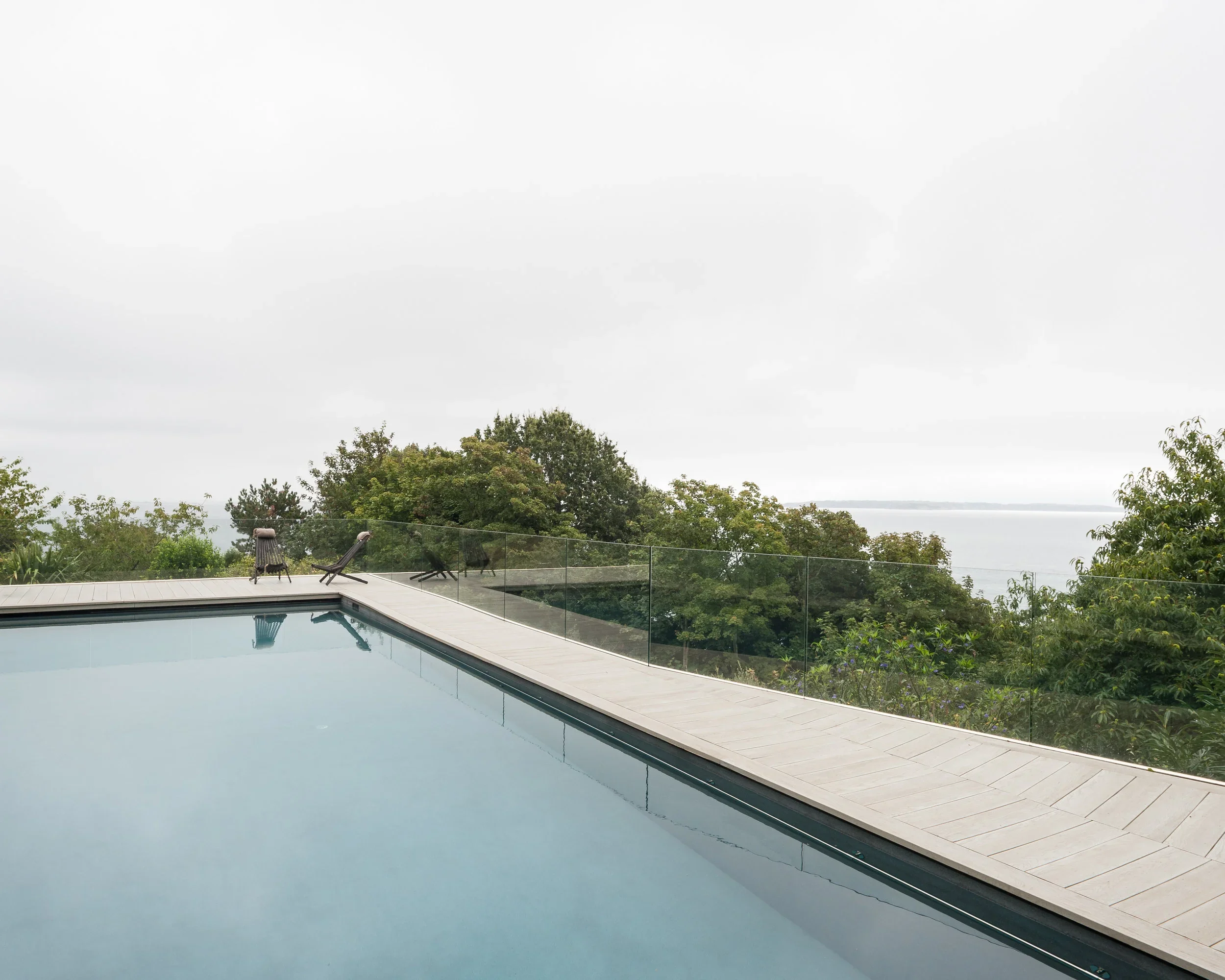 We worked closely with the structural engineers to design a pool structure that was appropriate to the sloping landscape, but also be cost effective. An innovative hybrid trench and backfill foundation was designed to use the majority of the excavated materials on site, while providing a sound base for the specialist pool contractor to set up shuttered and blown concrete for the pool shell. A steel frame wraps around the concrete structure to provide the base for the composite decking. Frameless glazing runs around the perimeter of the pool with no visible fixings, allowing uninterrupted views. The pool is heated by an air source heat pump and covered with a high specification solar cover to keep heat loss to a minimum. The pool is accessed via a cast ramp and includes stainless steel safety handrails around the internal perimeter. We worked closely with the pool specialist to design a slight change in level of the deck allows pool skimmers to be installed while keeping the freeboard depth a minimum. This also provides the minimum clearance for the retractable cover which can be remotely controlled.