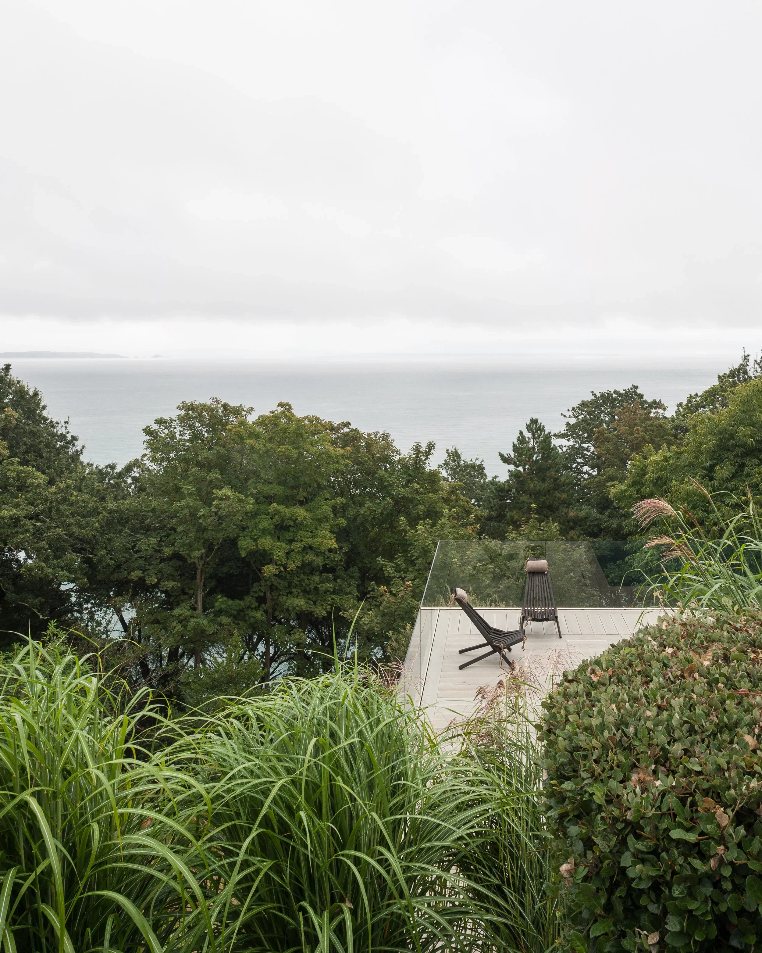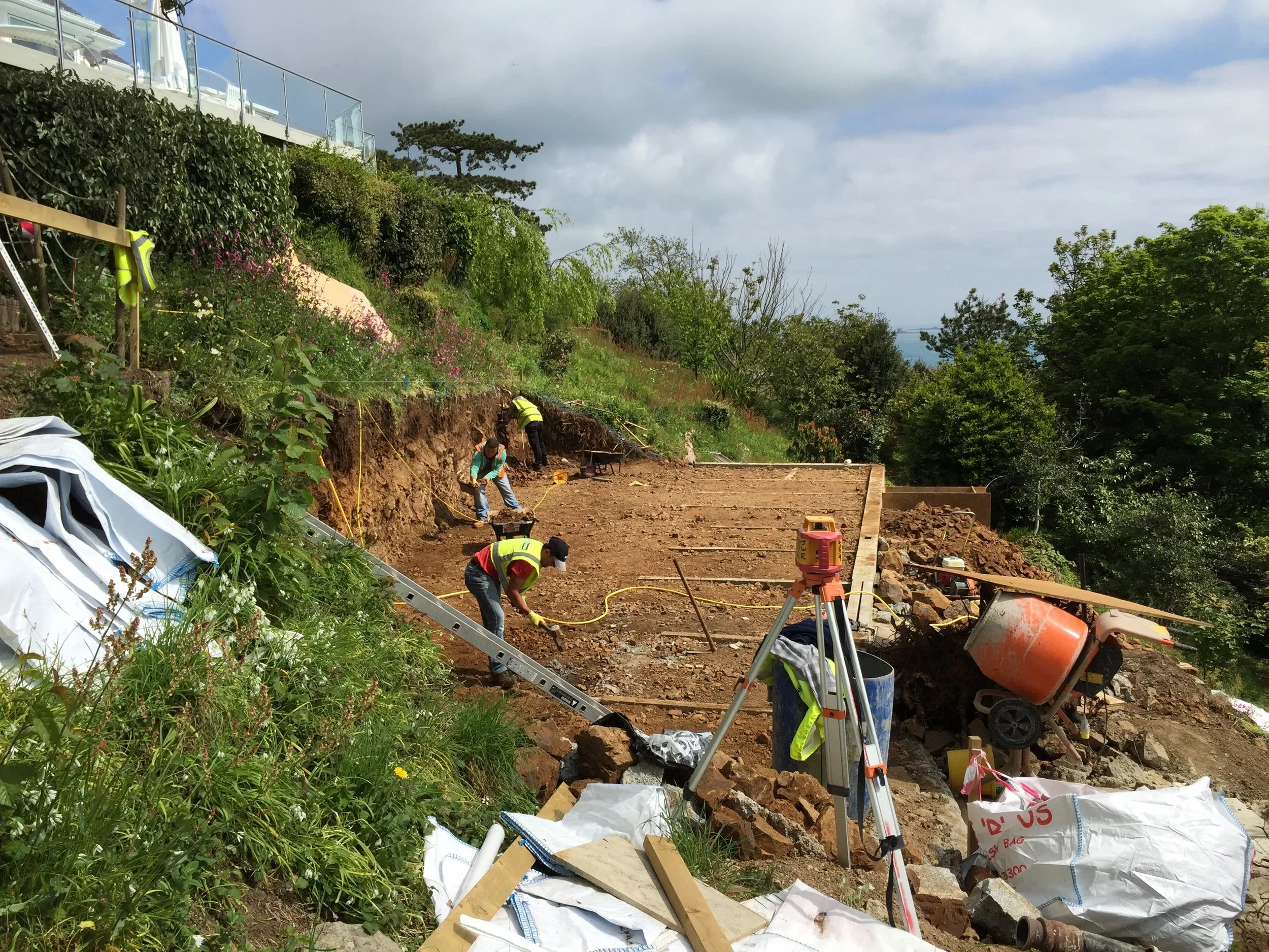 The house is located in the Village de Putron in Guernsey and boasts panoramic views of the Little Russell and islands beyond. Due to the location, access was difficult. Excavation was done without heavy machinery, and most of the materials had to be hand carried down a steep footpath. The position of the pool was carefully considered to allow safe access and also provide the panoramic views required.