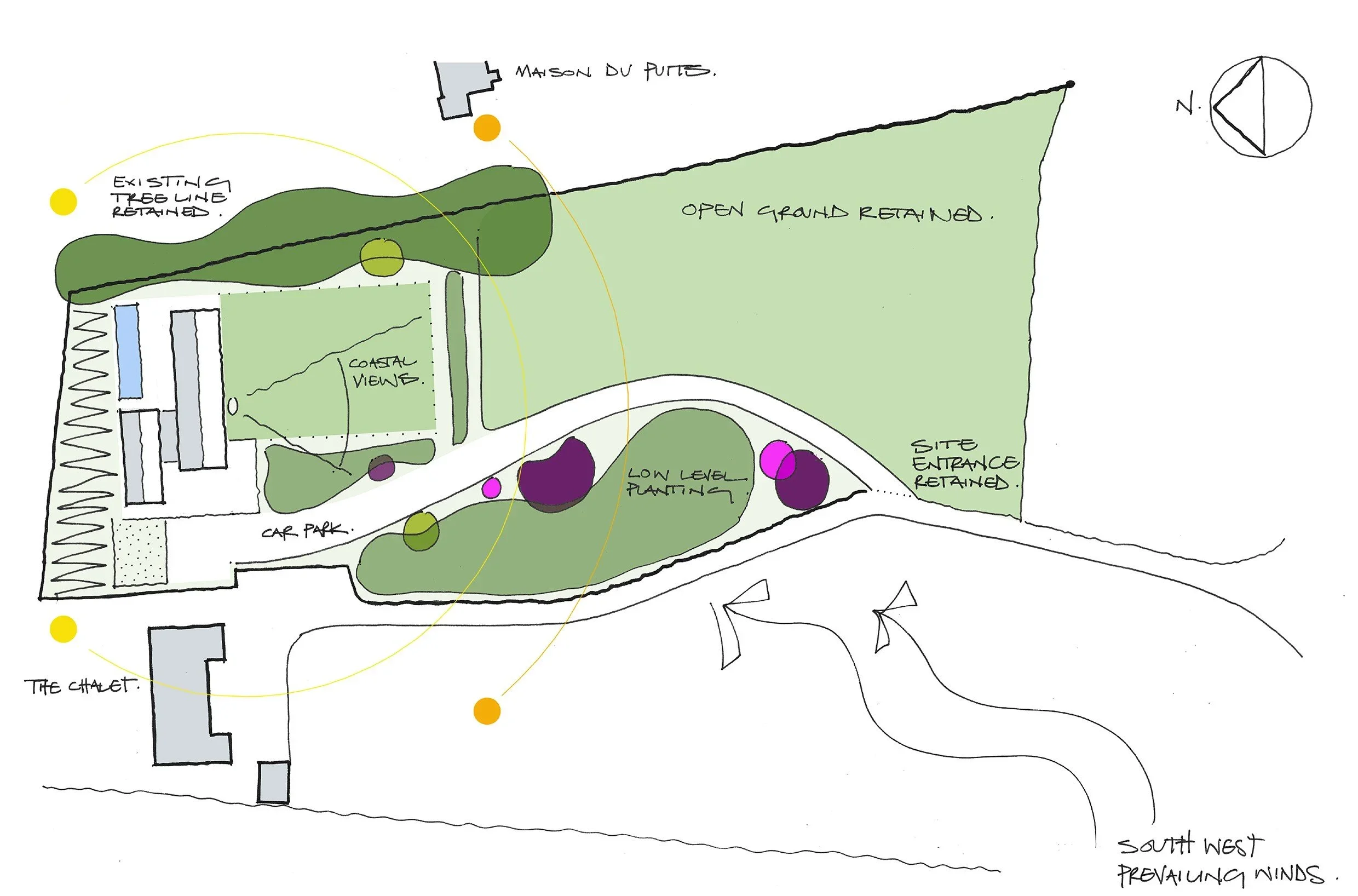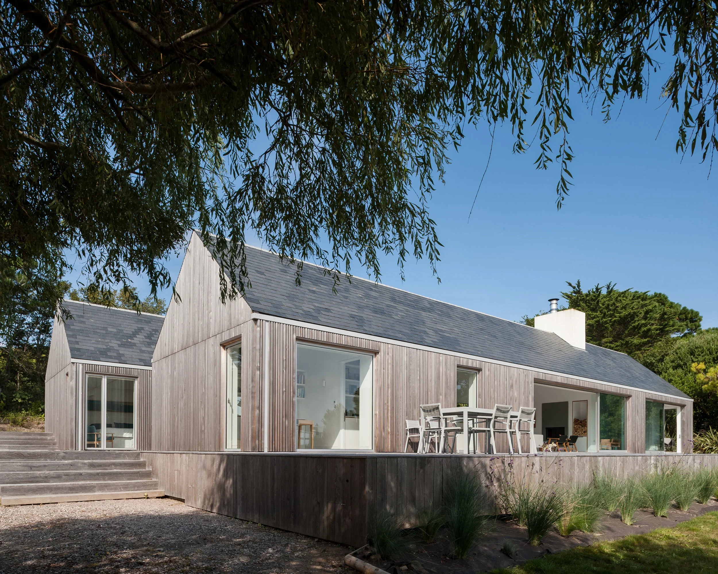 The brief was to design a new energy efficient, low maintenance house filled with natural light for a couple and their extended family when they visit. To meet strict planning rules, the property could only be 15% larger than the habitable footprint of the existing dwelling. The house is orientated to maximise the spectacular coastal views to the south of the site whilst retaining the sense of intimacy, set slightly into the hillside to the north.