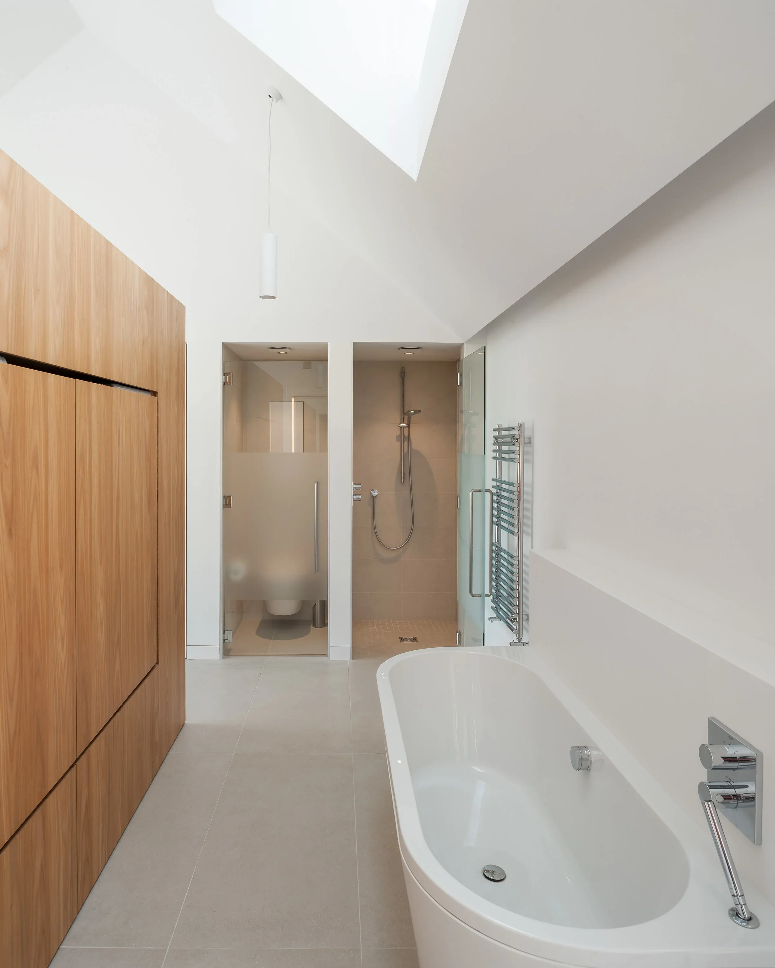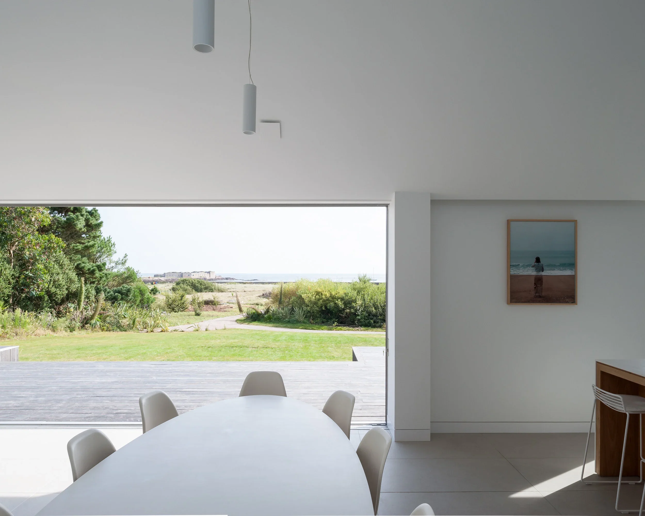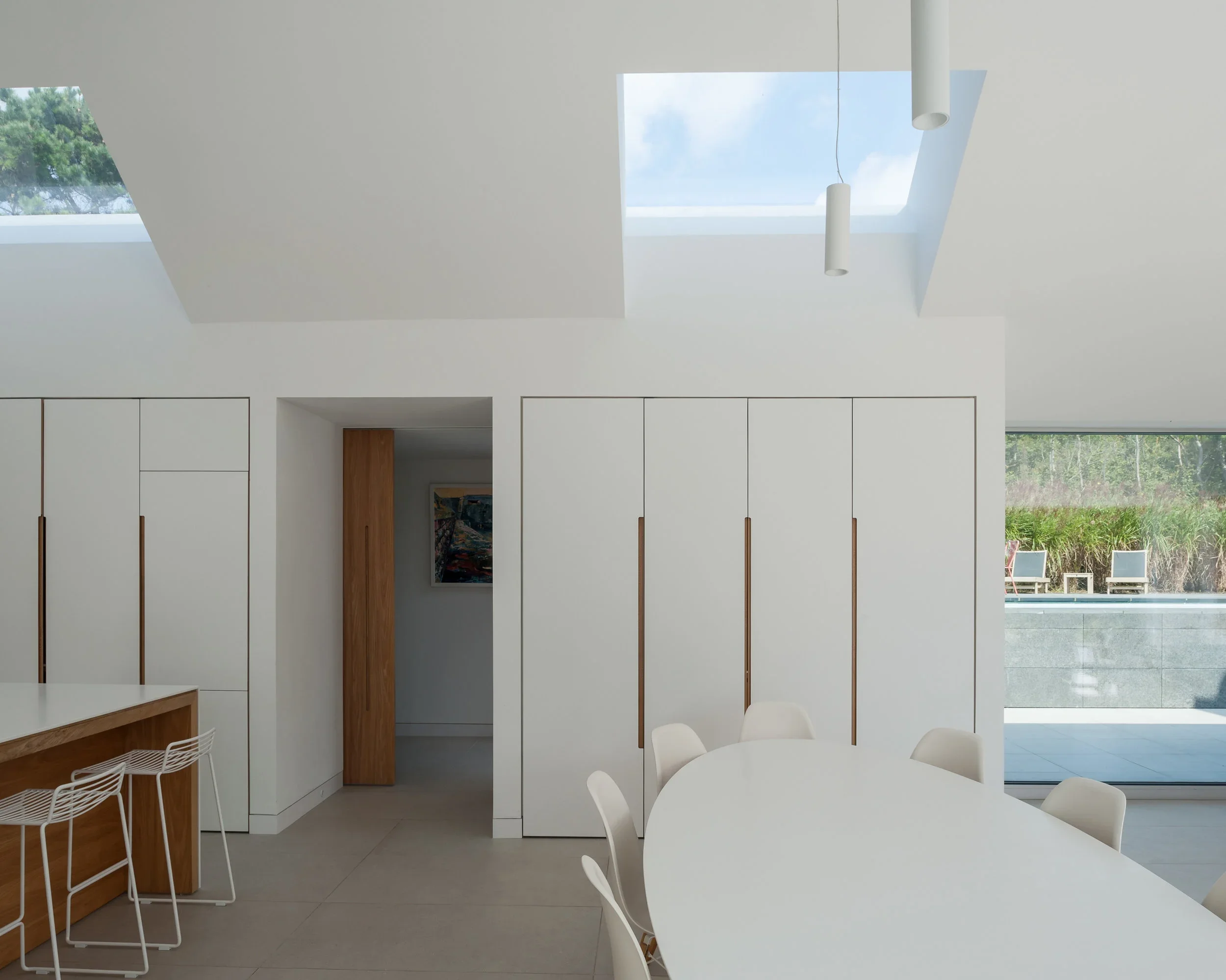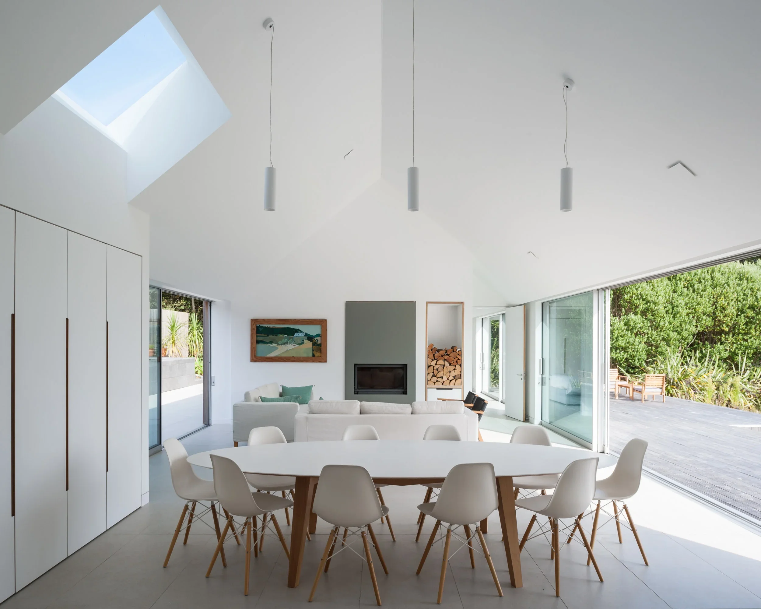 The vaulted main living space follows the internal line of the building envelope to create a sense of height and volume, linking directly to an outside terrace to the south via large sliding glass doors. An outdoor swimming pool, sheltered from the harsher elements, is set behind the main building and is accessed directly, once again from the living room via another set of large sliding glass windows.