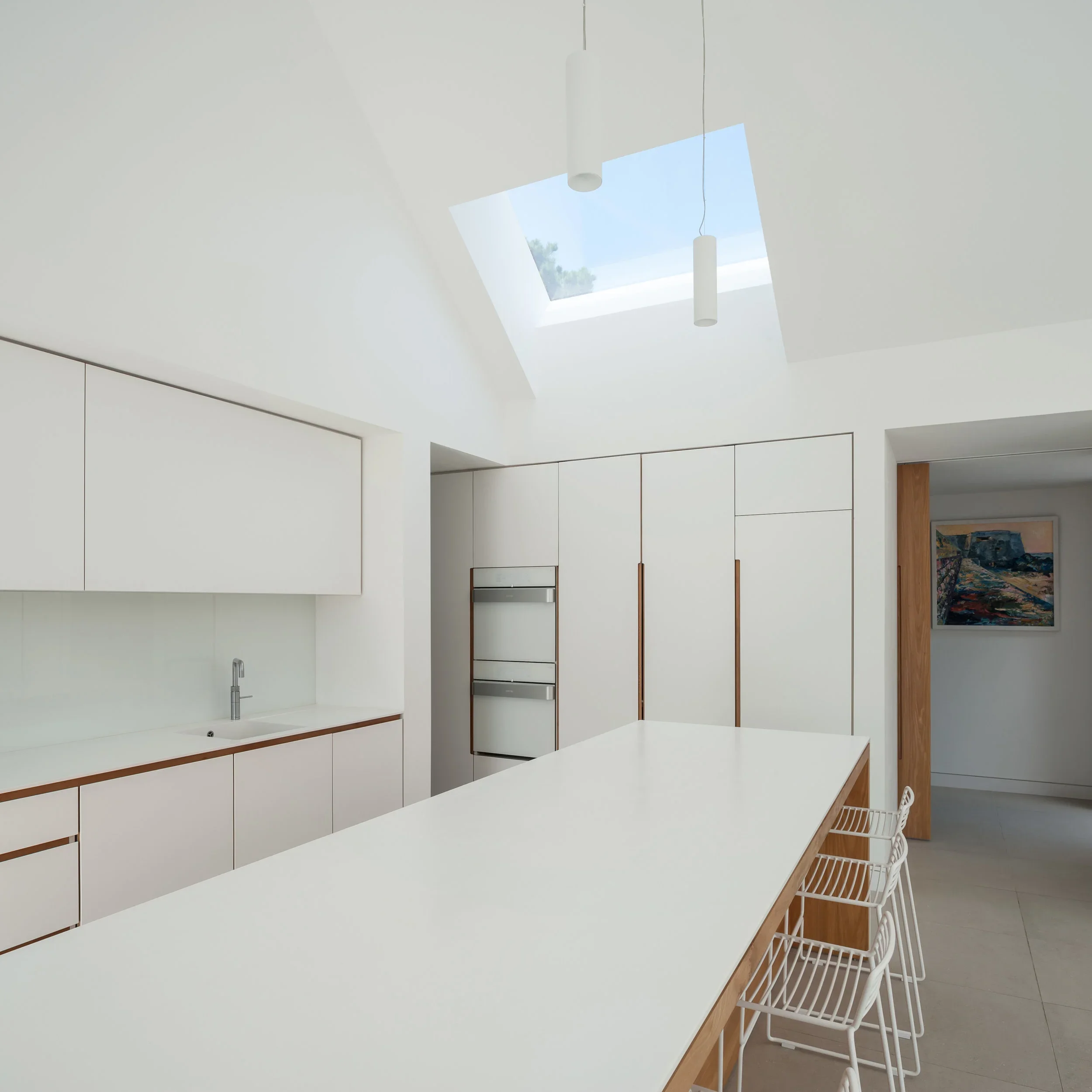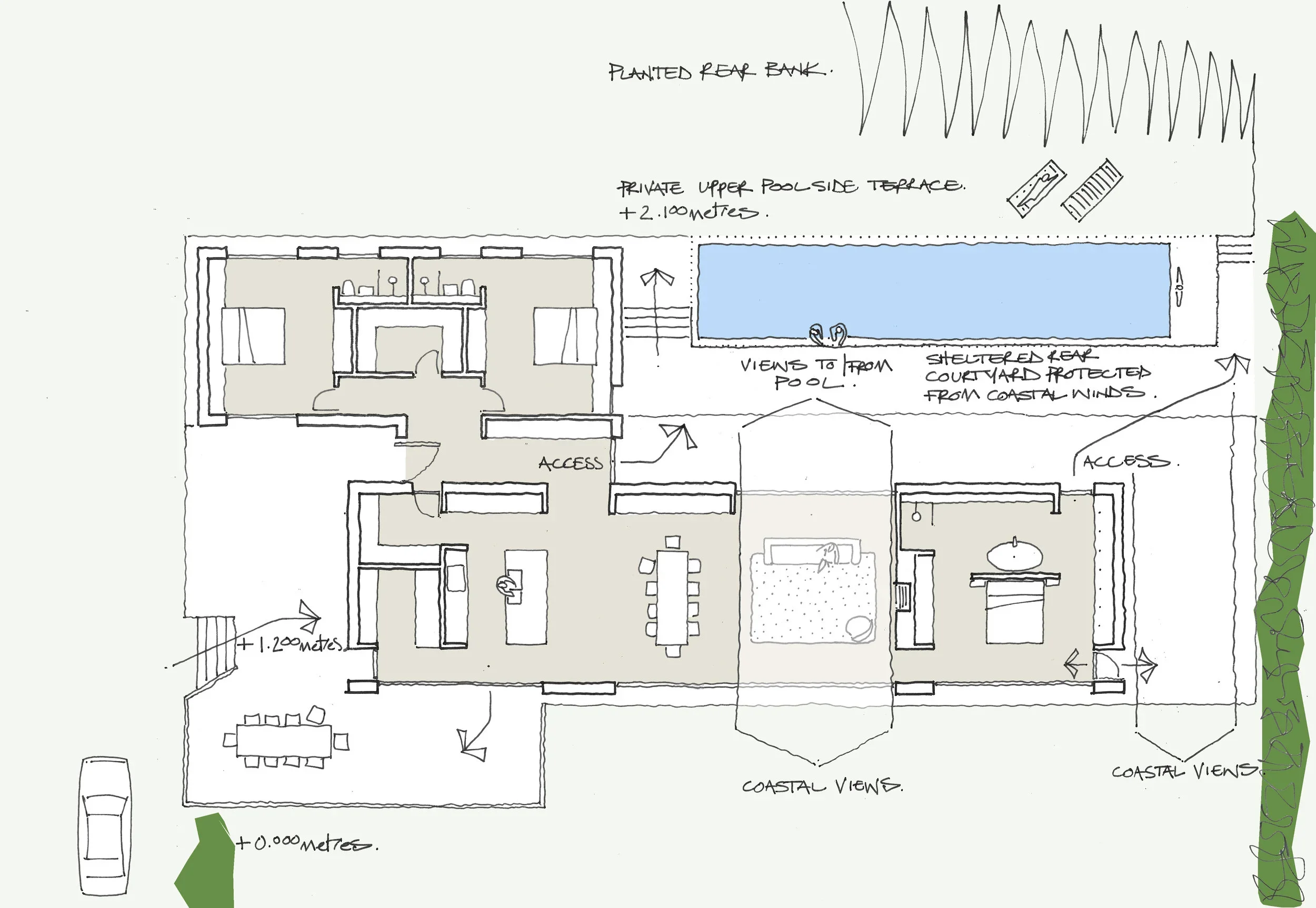 The design provides generous living spaces interconnected with the main bedroom located on the eastern side of the house and has a separate study to the western end. Additional bedrooms for family and friends are set within a separate building volume split from the main space by an entrance link corridor.