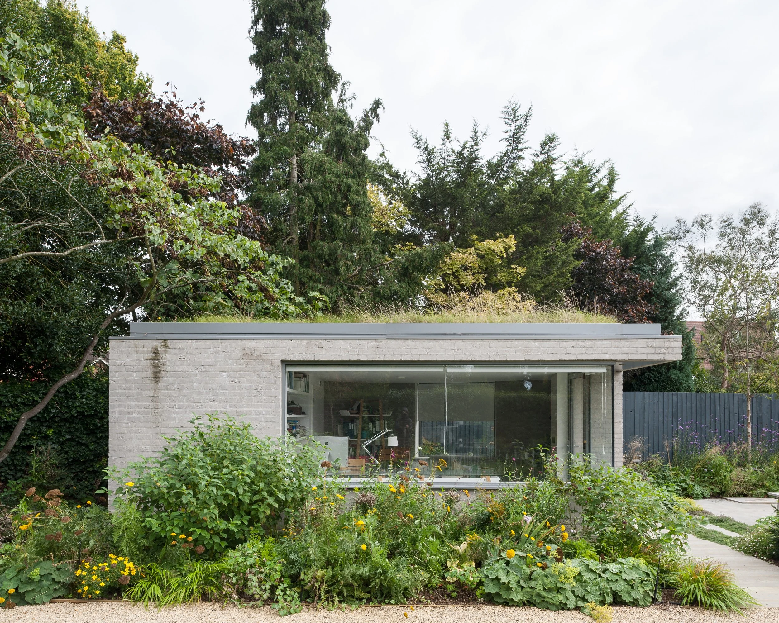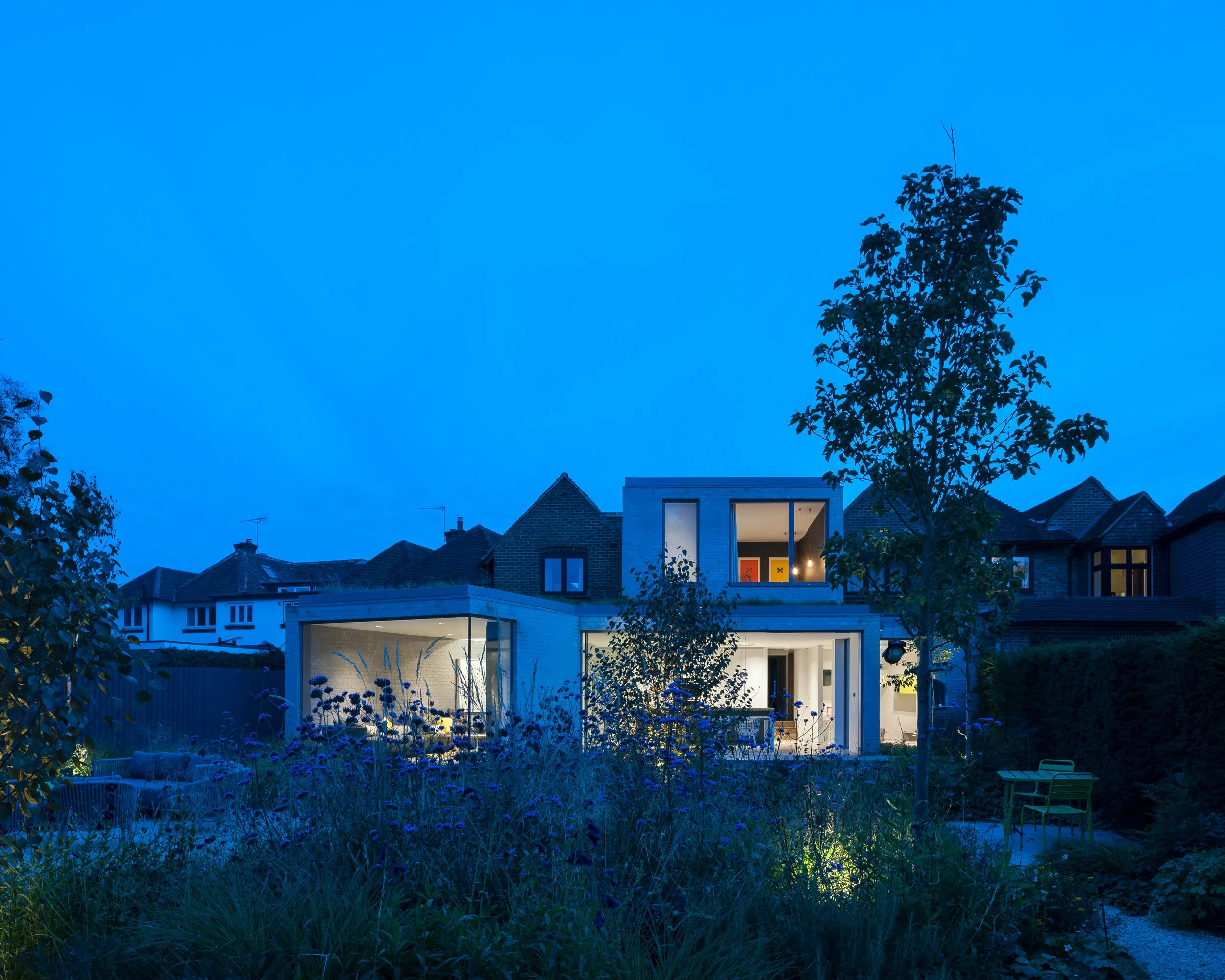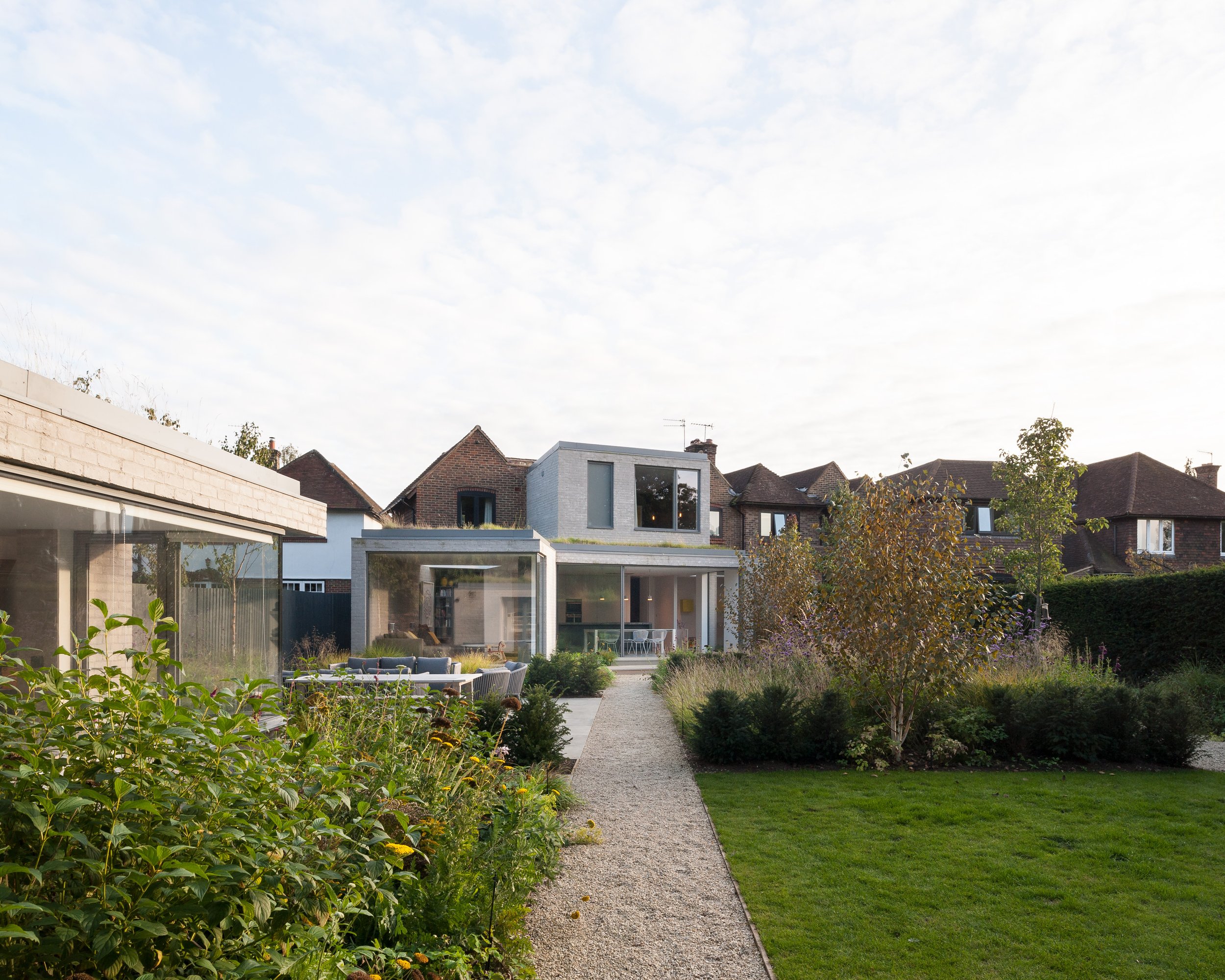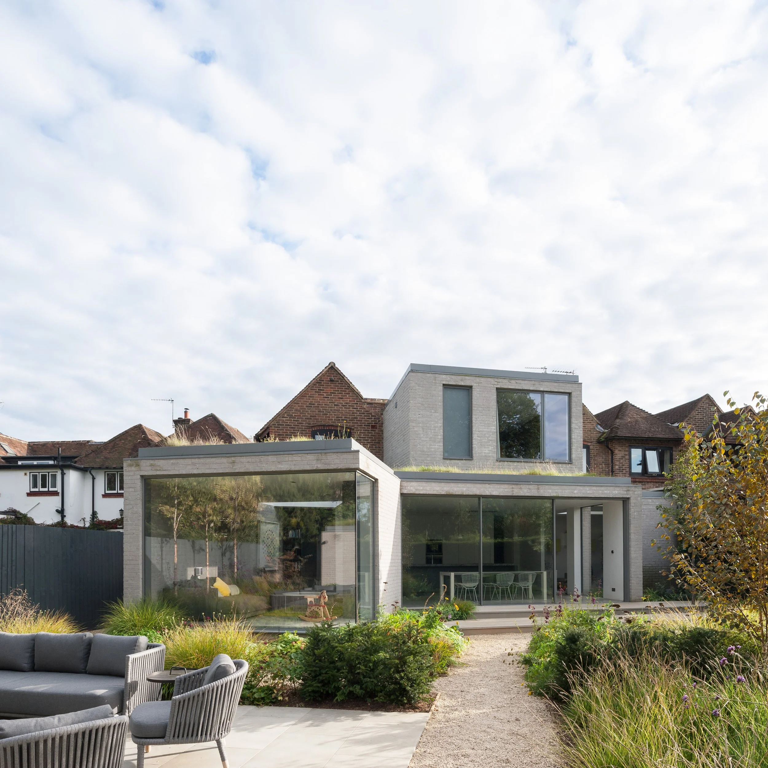 A new extensive planting scheme has been incorporated into the new works to soften the new buildings into the extended garden. The new buildings have been constructed from a contrasting light grey brick, with sedum roofs to the studio and ground floor extensions softening the house further into the garden setting.