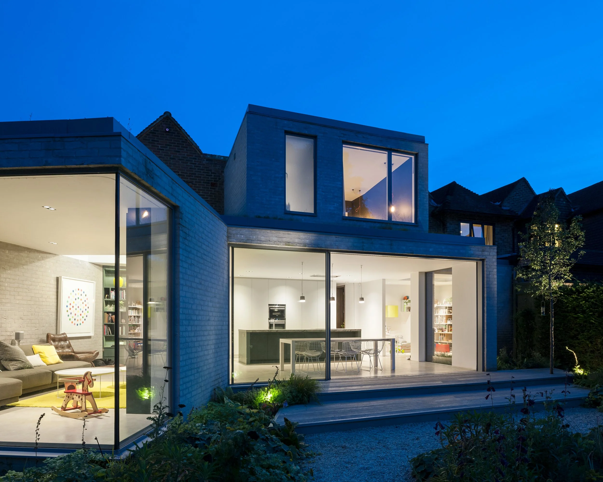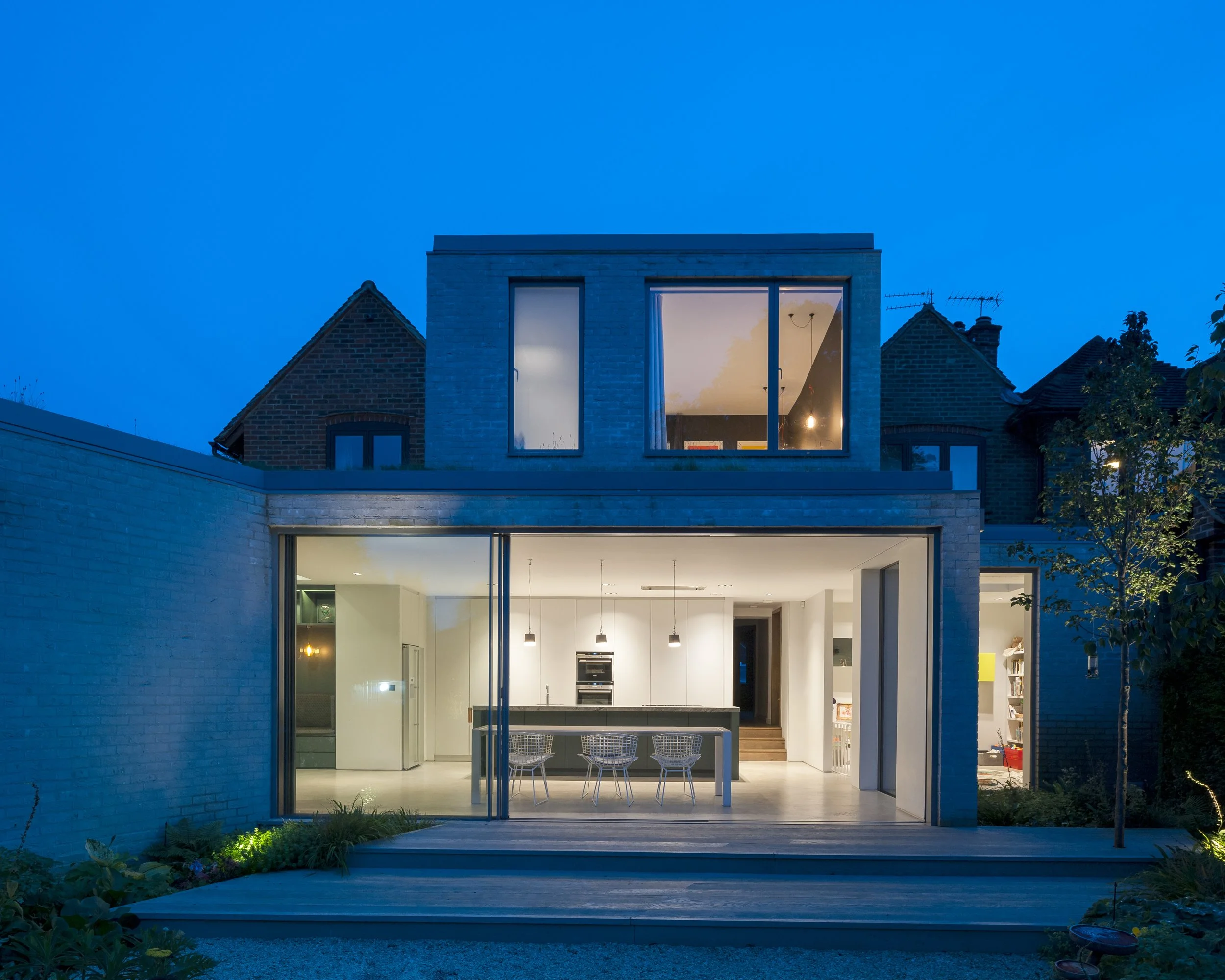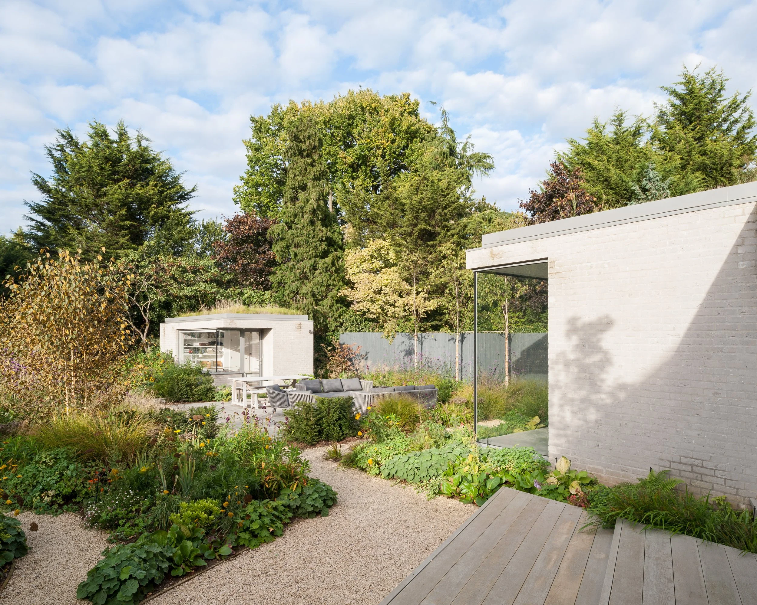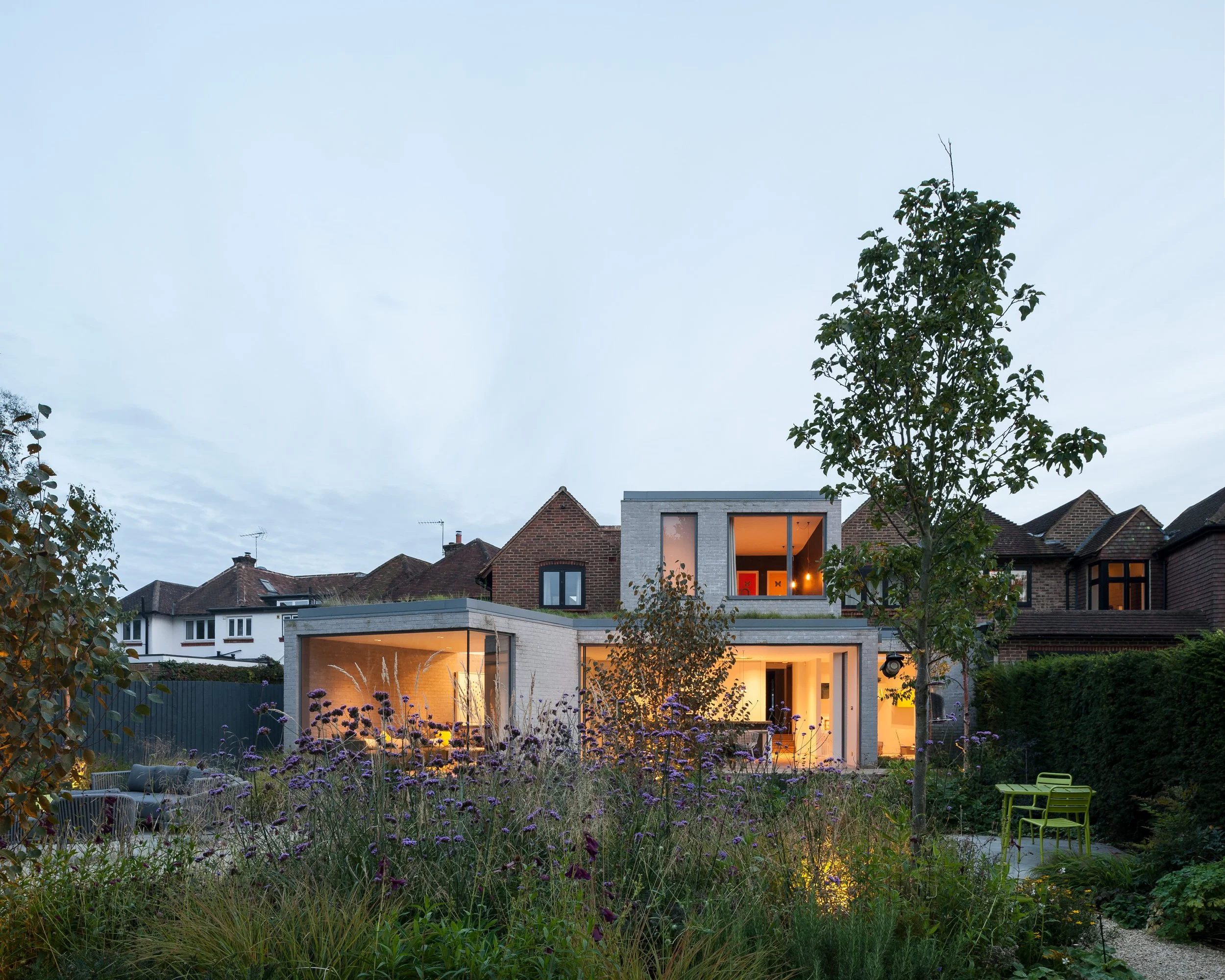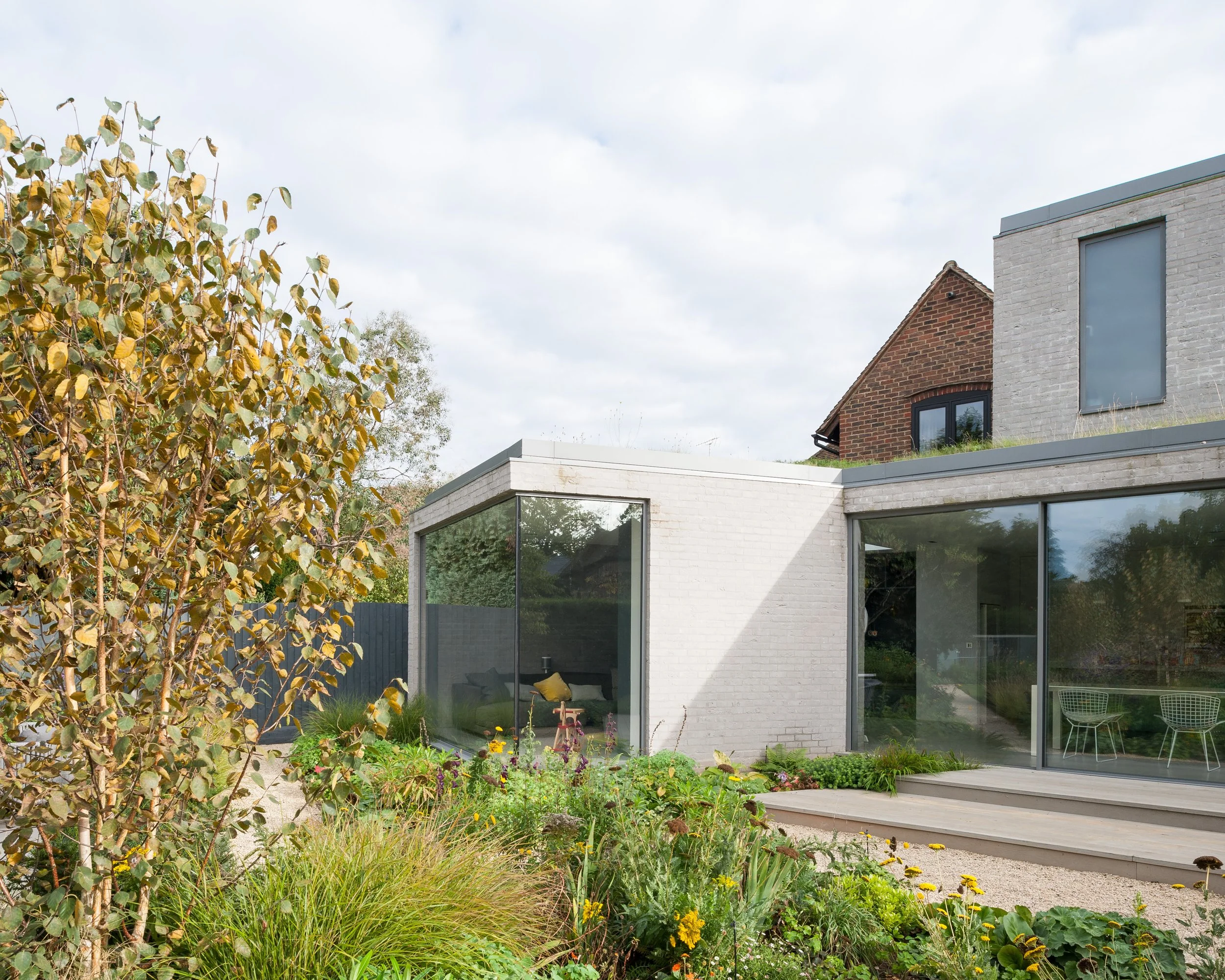A new extensive planting scheme has been incorporated into the new works to soften the new buildings into the extended garden. The new buildings have been constructed from a contrasting light grey brick, with sedum roofs to the studio and ground floor extensions softening the house further into the garden setting.