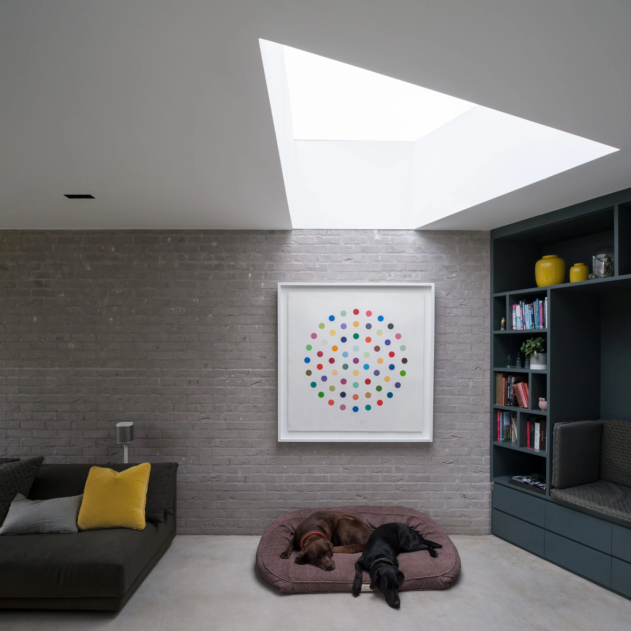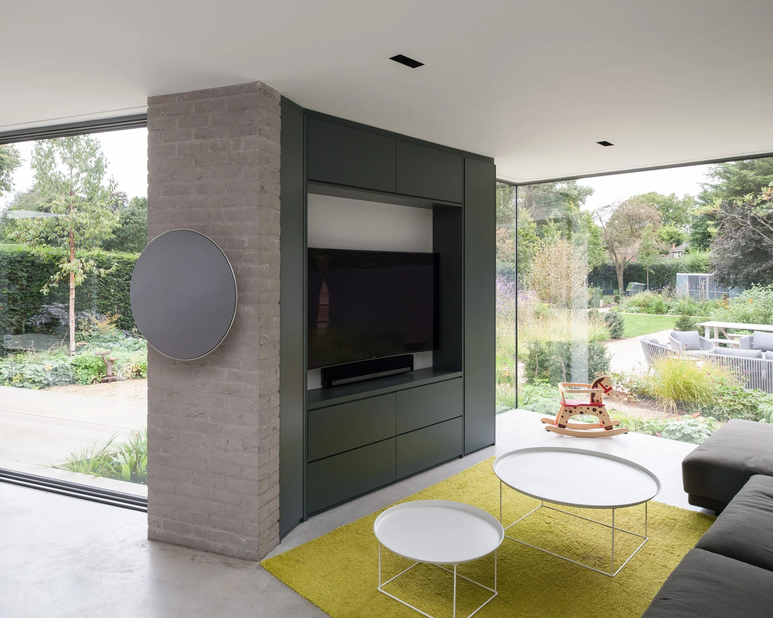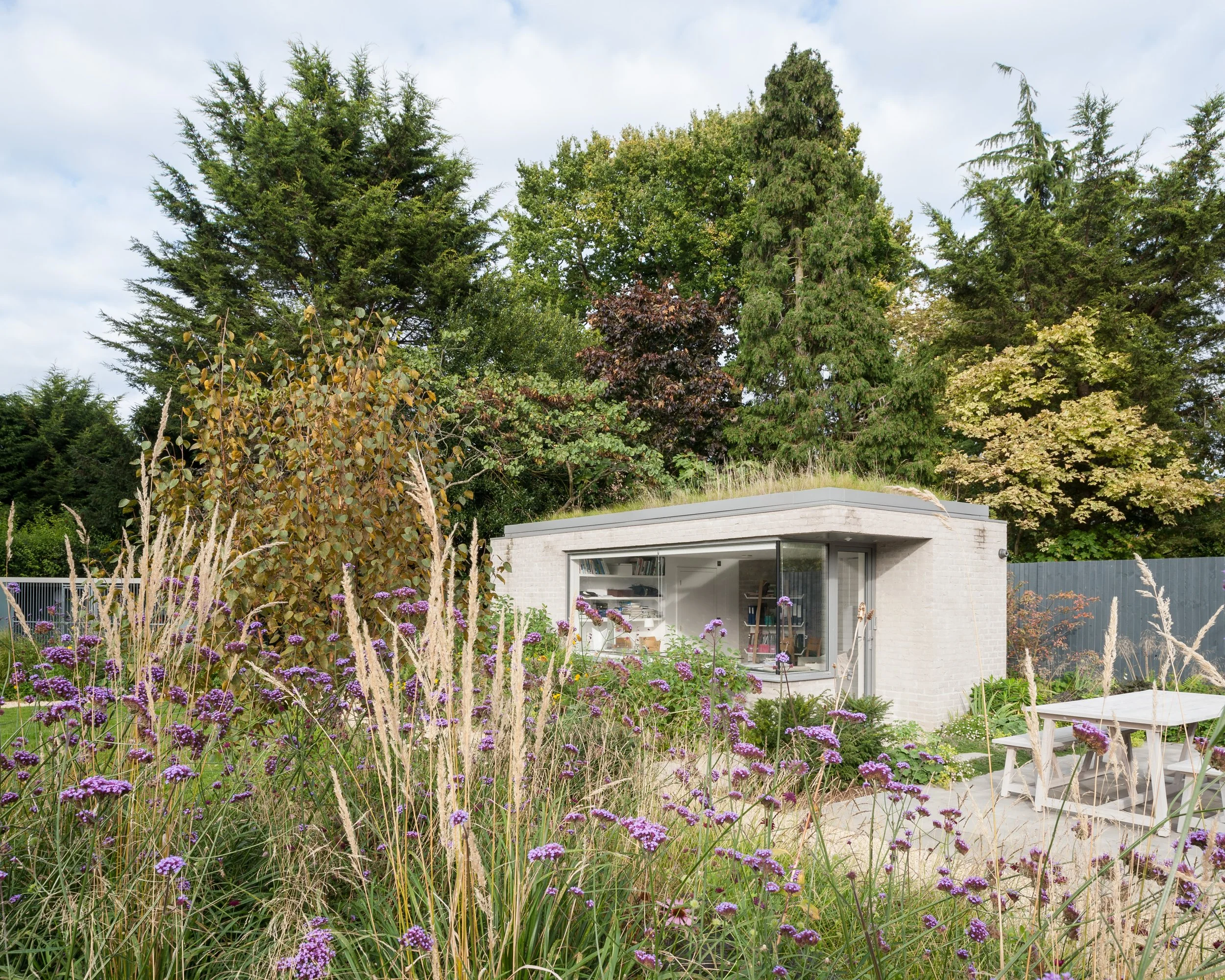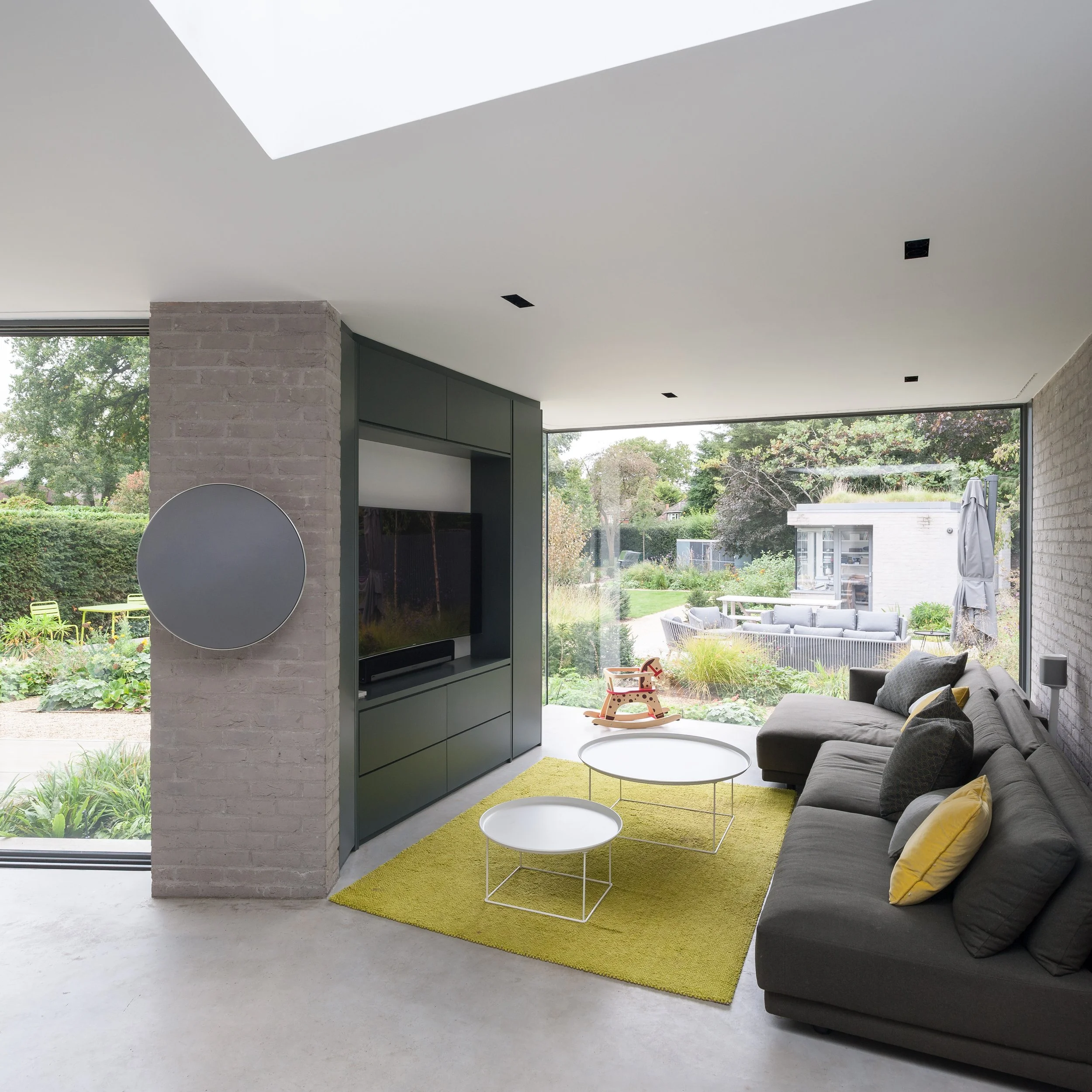 A new extensive planting scheme has been incorporated into the new works to soften the new buildings into the extended garden. The new buildings have been constructed from a contrasting light grey brick, with sedum roofs to the studio and ground floor extensions softening the house further into the garden setting.
