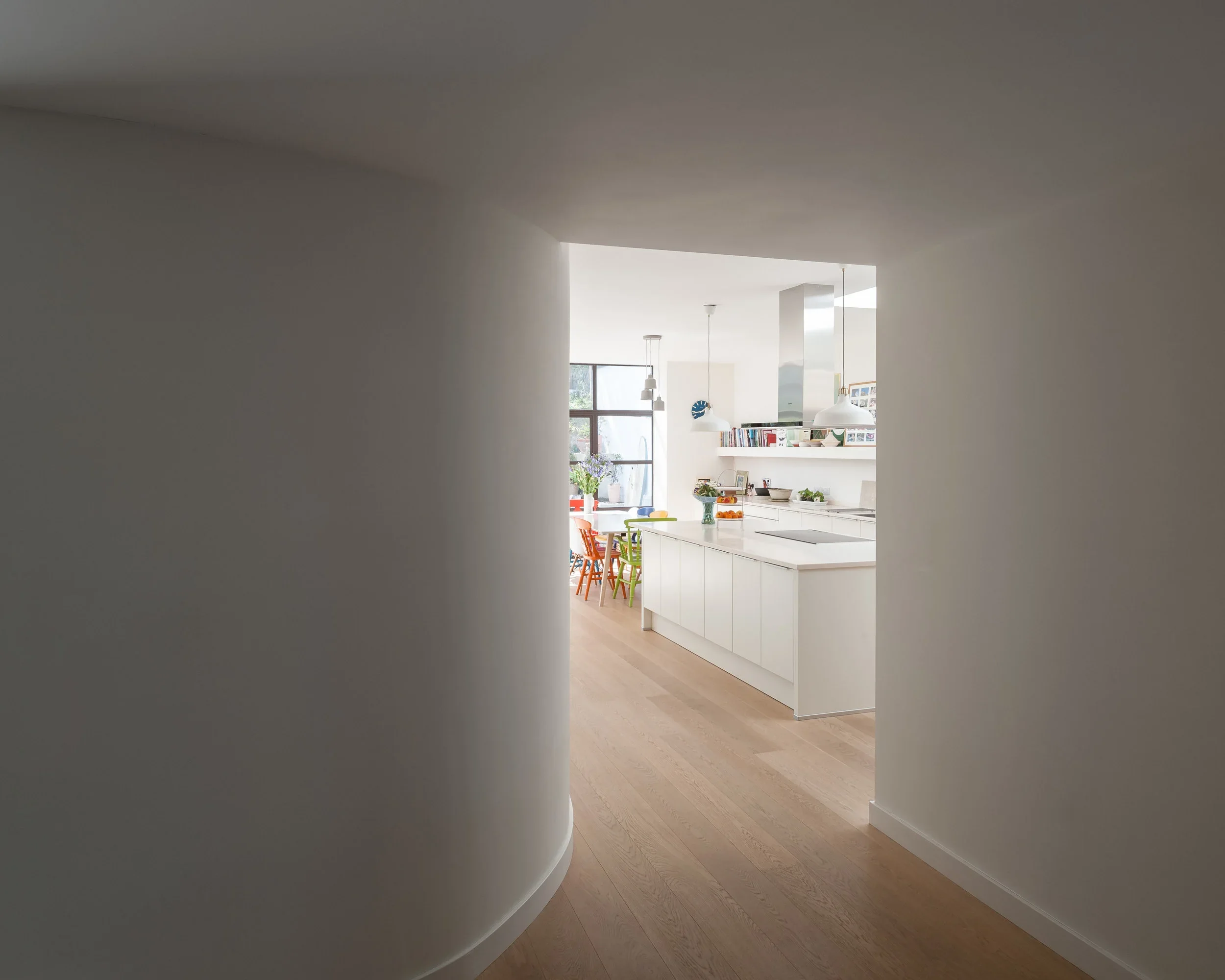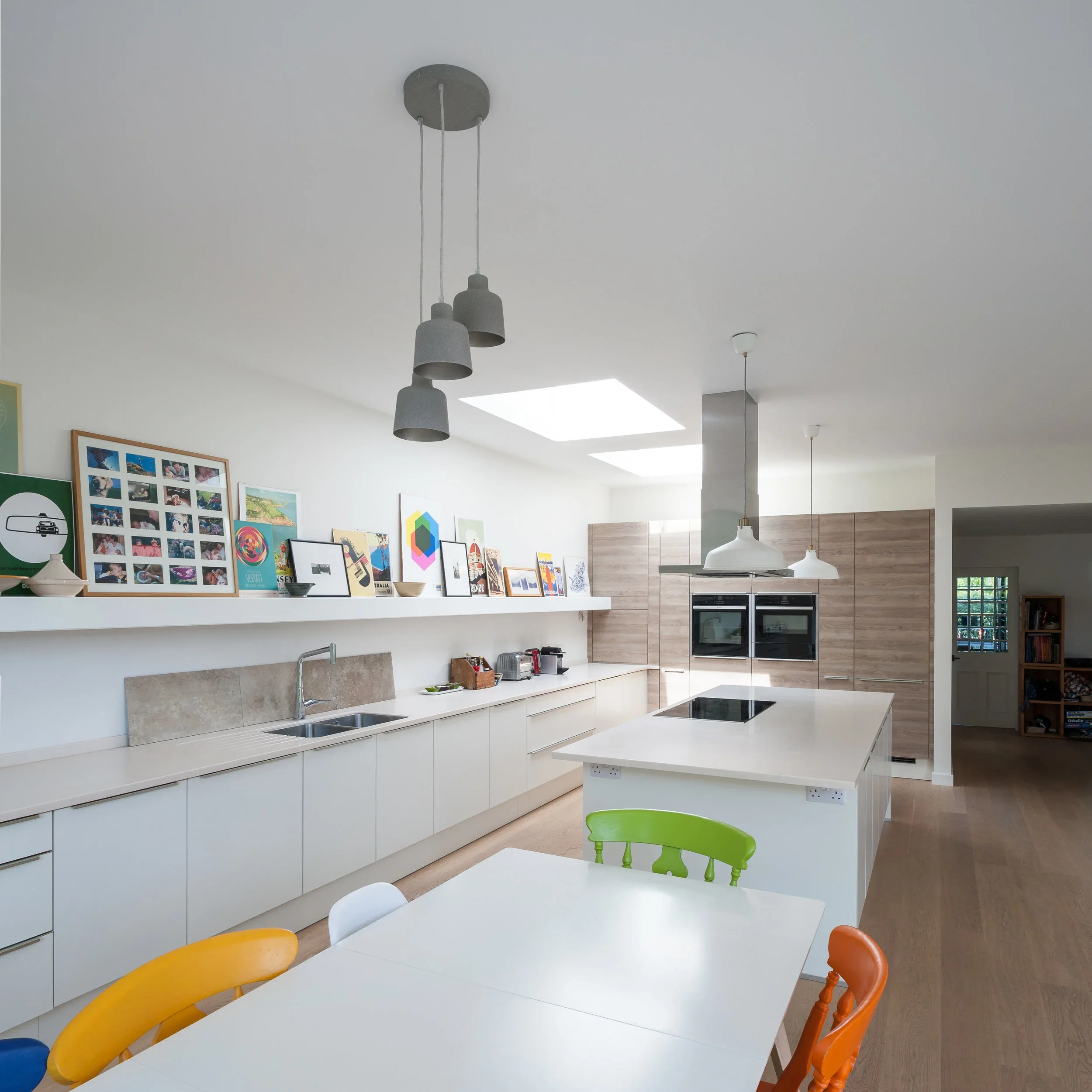 A large kitchen and dining area has been added to the rear of the property maximising the amount of light and space in the new family home. An informal lounge area has also been included in the end of the extension which makes use of the garden views, creating a place that the family can congregate. A new utility and pantry area been allocated as well as an existing lounge, dining and study restoration.