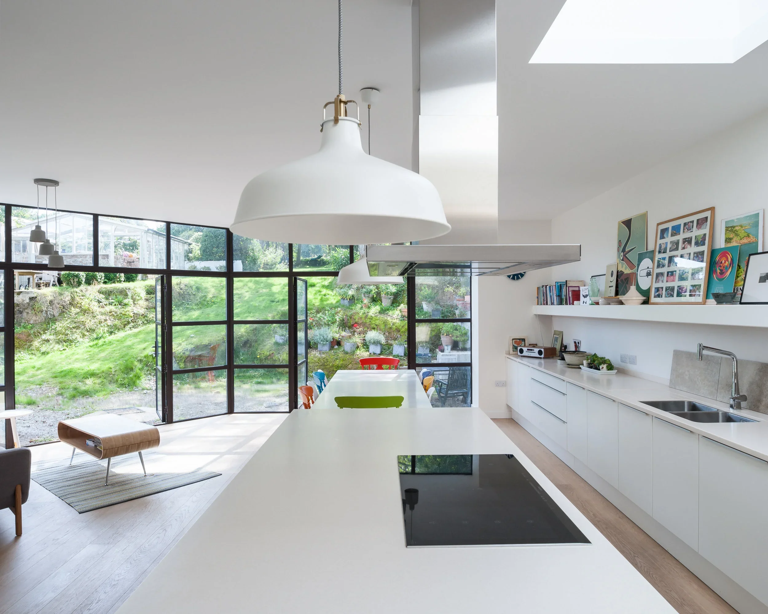 The new extension stretches into the garden strengthening the house’s connection to outdoors. Here, floor to ceiling glazing lead to an outdoor seating area which is sheltered from the wind and acts as a sun-trap.