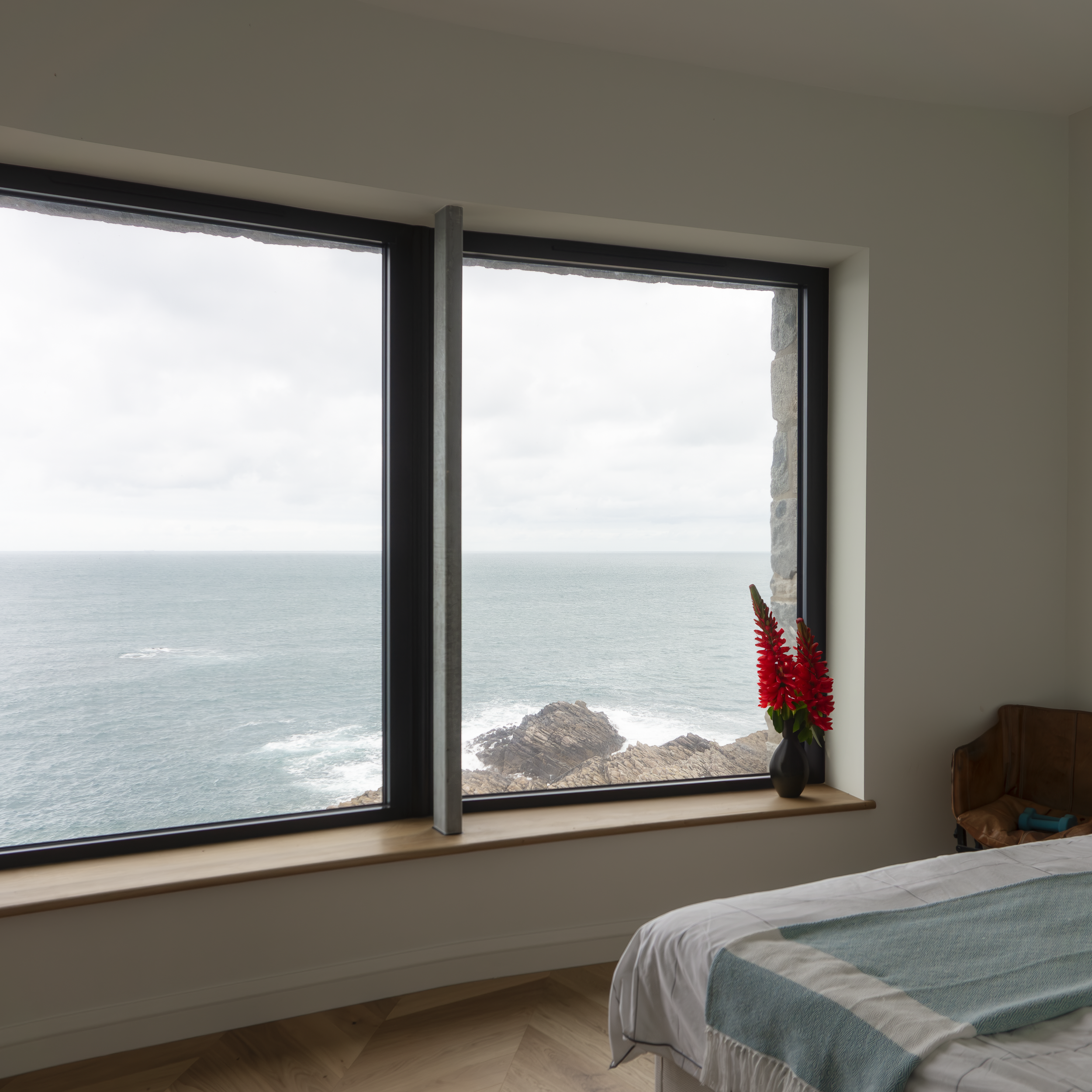 Continuous panoramic glazing encircles the building, framing views from the lighthouse to the east through to the beach in the west. Generous expanses of glass flood the interior with natural light while maintaining a strong visual connection to sea, sky and landscape. The architecture invites constant engagement with the elements, from dramatic coastal storms to calm, clear horizons.