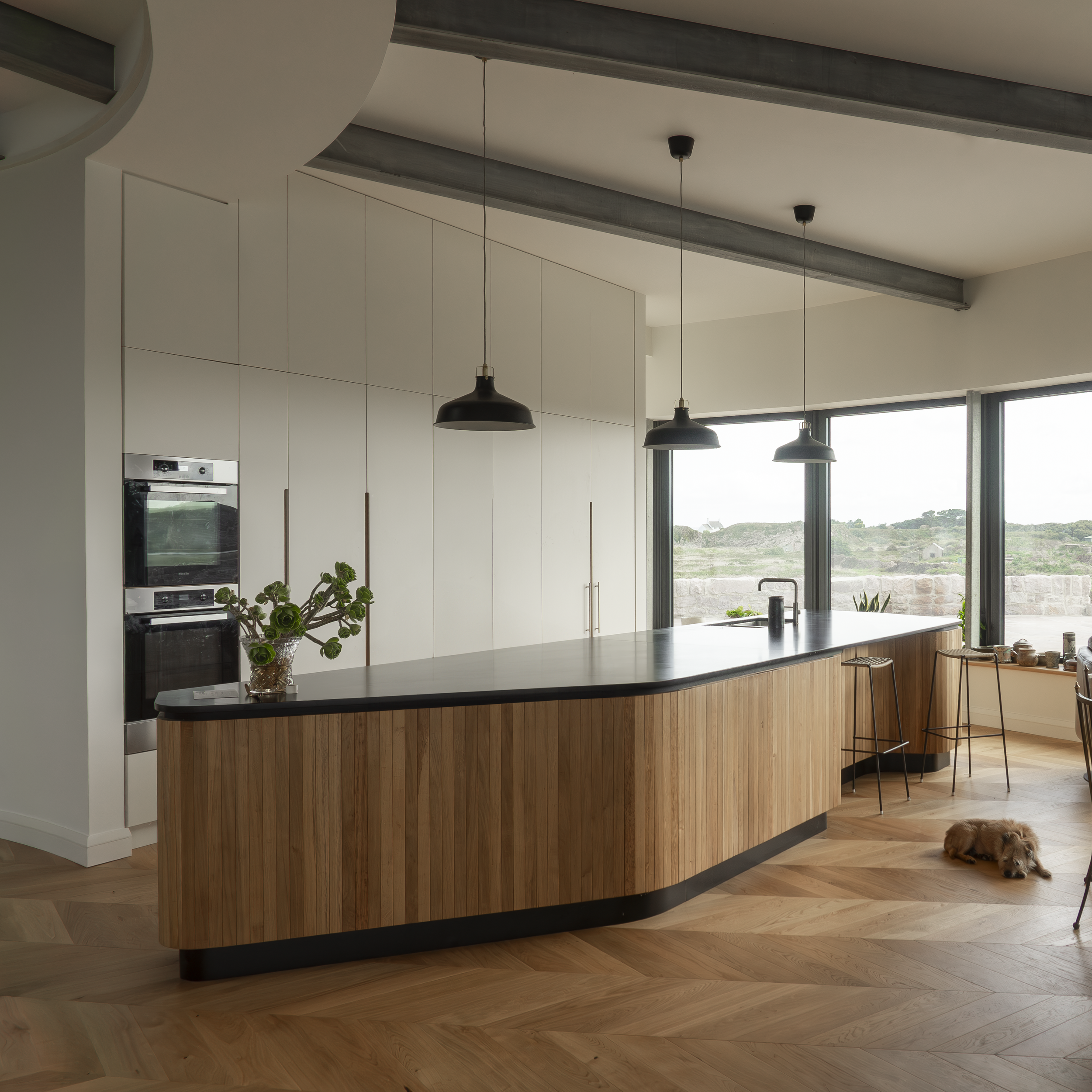 Internally, the Northern Ramparts combines contemporary luxury with careful spatial planning. The southern half of the plan is arranged as an open-plan living space, maximising daylight and views, while bedrooms are discreetly located within the northern arc. A central oculus rooflight introduces daylight into a more intimate secondary living area at the heart of the plan. All bespoke joinery, including the kitchen, was crafted by master joiner Dominic Ash. The circular plan encourages fluid movement throughout the house, creating a sequence of interconnected spaces with distinct atmospheres and spatial qualities.